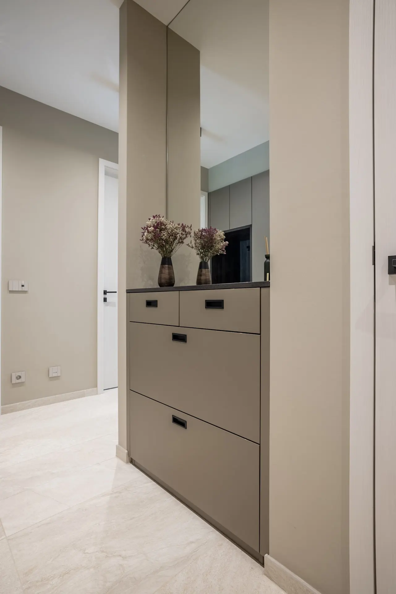 Fitting out of two niches into a wardrobe with a seat and shoe cabinet in the entrance hall of our clients' apartment. Our interior architects proposed a small custom-made shoe cabinet with folding doors allowing the storage of shoes vertically in this very shallow niche. Above these two shoe units, we provided two small drawers with pockets. The rest of the niche is equipped with a custom-made mirror covering the entire surface to give an impression of depth on this side. In the corridor axis, our interior design team equipped the entrance hall with a dressing room and a seat for taking off and putting on shoes. This niche is also equipped with three coat hooks for the occasional guest coat.